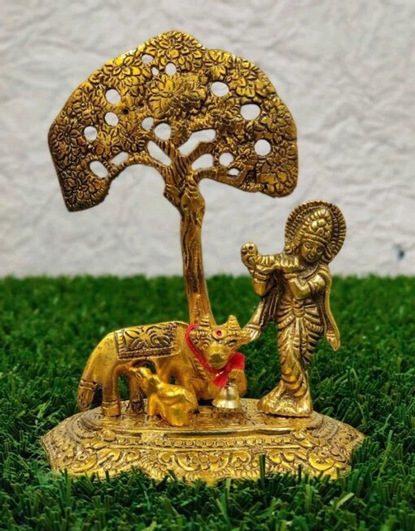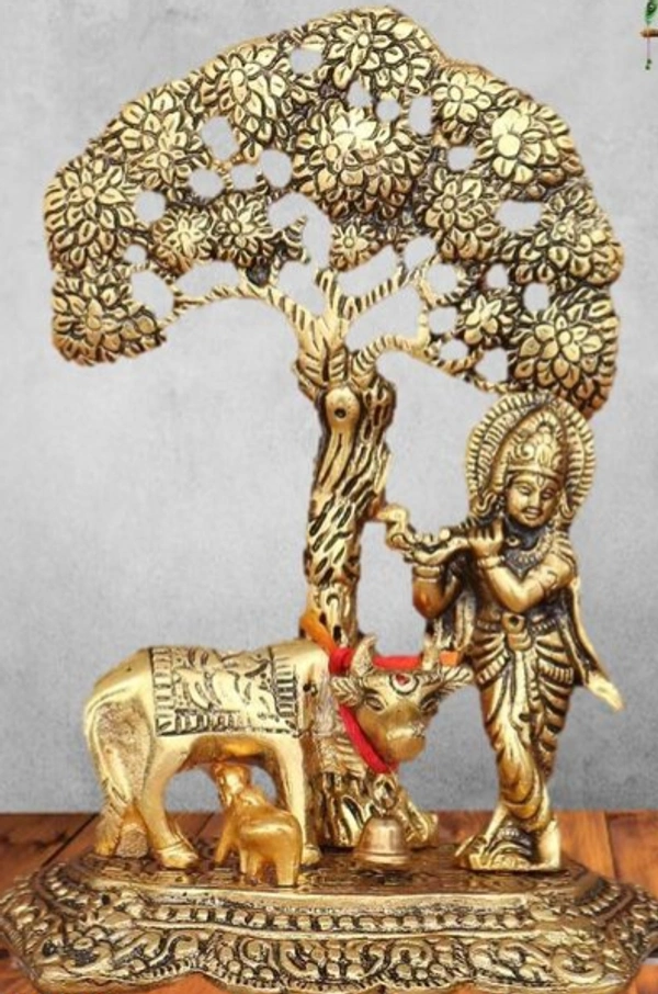 Name: Gadgetify Metal Krishna with Cow Standing Under Tree Plying Flute Decorative Showpiece - 17 cm (Brass, Gold) Decorative Showpiece - 18 cm (Metal, Gold)